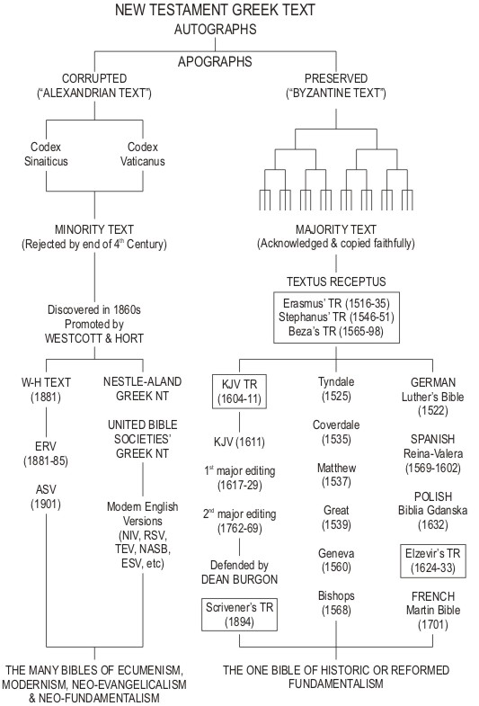The majority of the manuscripts, on the other hand, reflect uniform and ancient readings. Most textual variations or copying mistakes are of the minor sort that can be easily corrected when carefully compared. This Burgon acknowledged, “Happily, our manuscripts [i.e. the Traditional Text] are numerous: most of them are in the main trustworthy: all of them represent far older documents than themselves” (Revision Revised, 18). Surely, the majority text must be the favoured text being most used, widely used and faithfully copied throughout the centuries. Burgon was absolutely correct to conclude, “With regret we record our conviction, that these accomplished scholars have succeeded in producing a Text vastly more remote from the inspired autographs of the Evangelists than any which has appeared since the invention of printing [viz., the Textus Receptus]” (Revision Revised, 25–26). Indeed the inspired words of the majority manuscripts are all found in the Textus Receptus underlying the KJV.